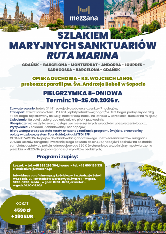 Ta pielgrzymka prowadzi przez najważniejsze maryjne sanktuaria Hiszpanii i Francji – miejsca, w których od wieków rozbrzmiewa modlitwa, rodzą się nawrócenia i dojrzewa wiara. To nie jest zwykła podróż, lecz droga serca, podczas której każdy dzień zaprasza do głębszego zawierzenia Bogu przez ręce Maryi- pozwól się Jej poprowadzić.