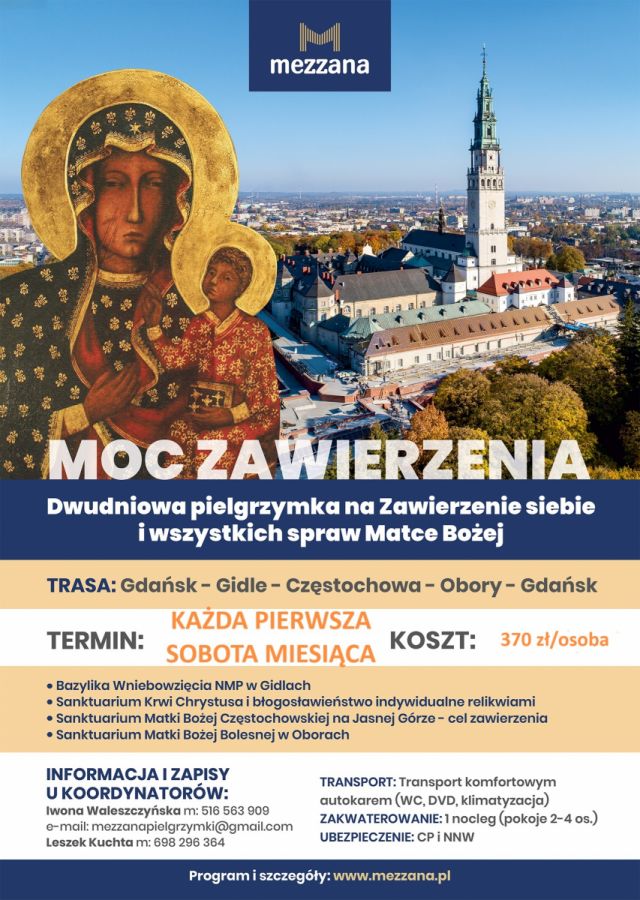 Wyjazd z Gdańska Oliwy o 06:00. Przejazd do Bazyliki Matki Bożej Gidelskiej- Uzdrowienie Chorych. Do godności bazyliki mniejszej gidelski kościół podniósł w 1989 roku papież Jan Paweł II. Według tradycji miejscowy rolnik Jan Czeczek wyorał maleńką figurkę Matki Bożej, która wkrótce zasłynęła cudami. Całość przekazu przedstawiono na obrazach w bazylice. Gidle, jako miejsce słynące z otrzymania niezliczonych łask, nawiedzane jest do dnia dzisiejszego przez liczne rzesze pielgrzymów. Nawiedzili je również polscy królowie: Władysław IV Waza, Jan II Kazimierz i Michał Korybut Wiśniowiecki oraz nuncjusz apostolski ks. Achilles Ratti przyszły papież Pius XI. Następnie przejedziemy do Sanktuarium Krwi Chrystusa, gdzie zostaniemy indywidulanie pobłogosławieni relikwiami Krwi Pana Jezusa, które pochodzą z Golgoty. Kolejno udamy się do miejsca naszego zakwaterowania w pobliżu jasnogórskiego klasztoru, gdzie spożyjemy obiadokolację. O godzinie 17:00 na Jasnej Górze rozpoczyna się spotkanie formacyjne przygotowujące do aktu zawierzenia. O Godzinie 18:30 rozpocznie się najważniejszy punkt pielgrzymki - Msza Święta w Kaplicy Cudownego Obrazu podczas której zawierzymy siebie i wszystkie nasze sprawy Niepokalanemu Sercu Maryi Królowej Polski.